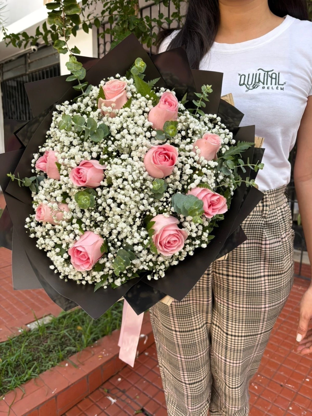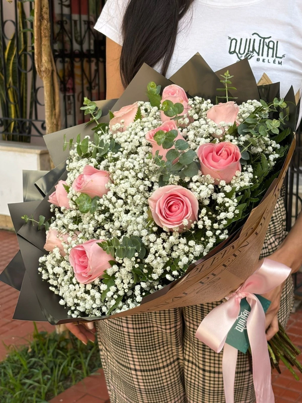 Destaques: - Composição Elegante: Composto por Gypsophila, Eucalipto, Rosas e uma folhagem de tirar o fôlego, ele é um verdadeiro show de beleza! - Tamanho Maior: Um presente que não passa despercebido – é o tipo de buquê que faz até as flores mais tímidas se destacarem!